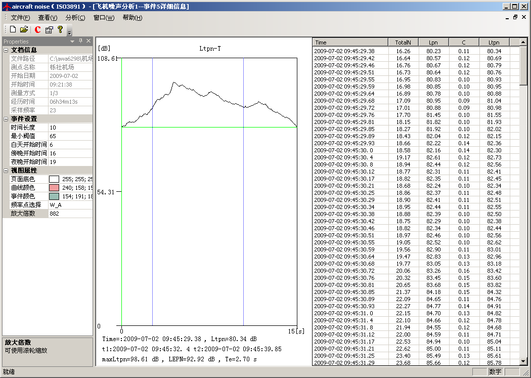 分析软件可以根据用户设定的判定依据自动判定出每一架次的飞行事件,按精密法或简易法计算出每一架次的有效感觉噪声级LEPN,再自动计算出全天的计权等效连续感觉噪声级LWECPN。还可根据各测点的测量结果或预测结果自动绘制噪声等值线图,生成报告。